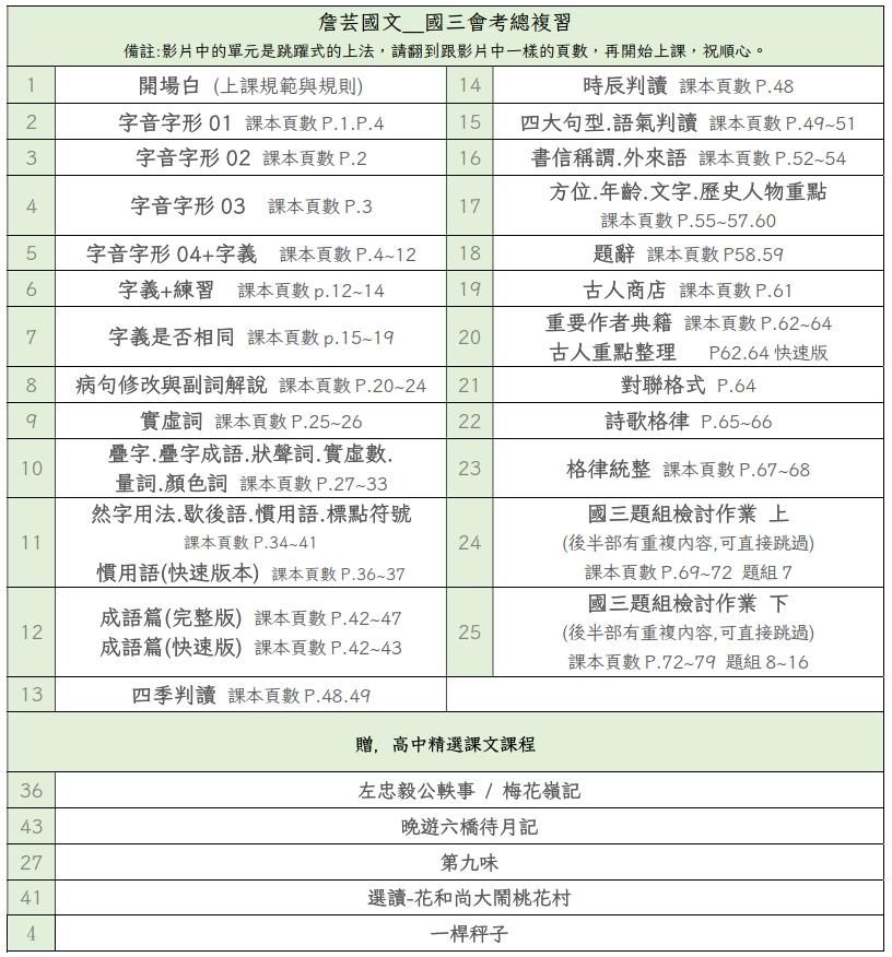 將國中三年內容整合成22個主題,共25部影片,每部影片時間落在1小時左右。