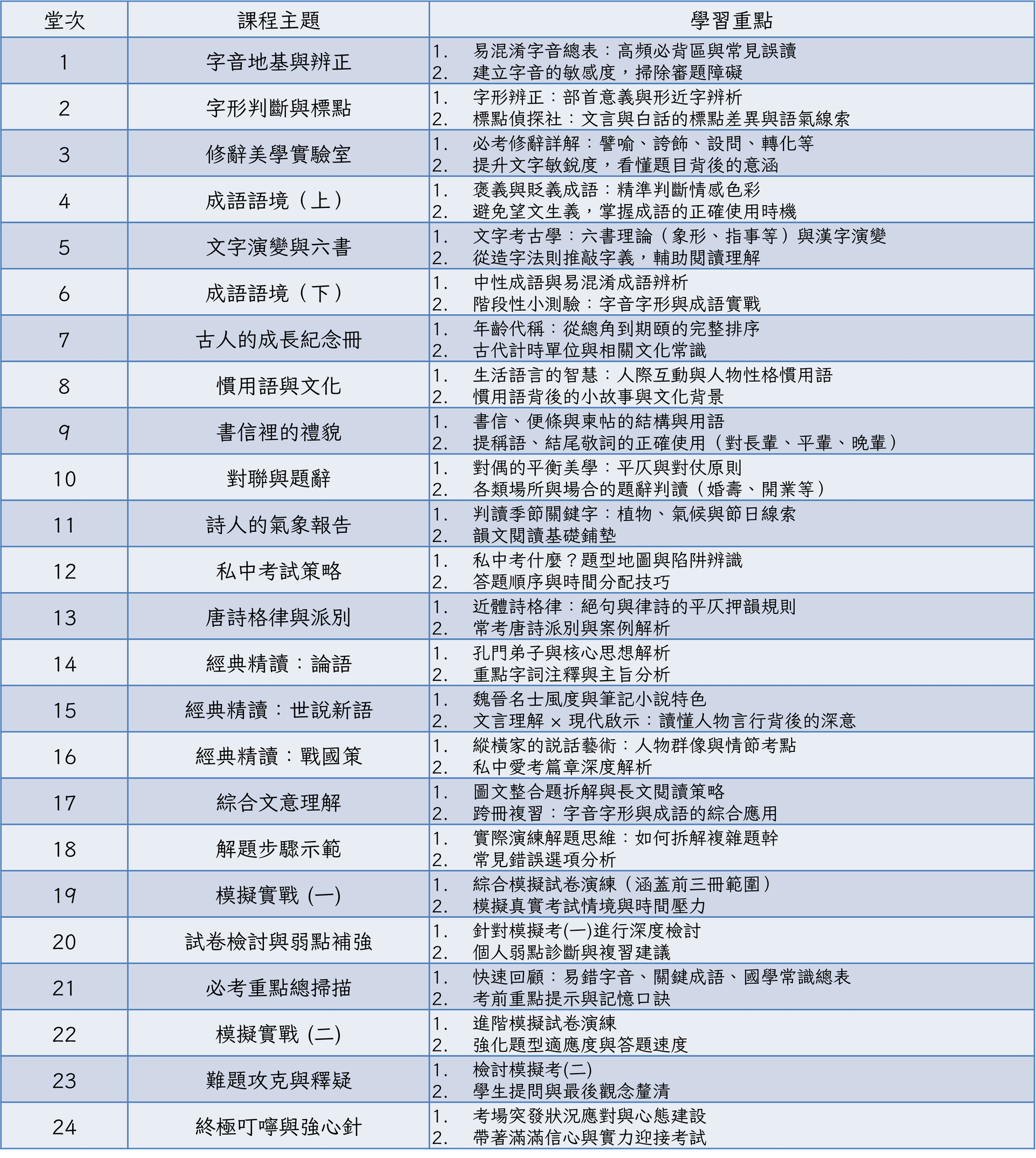 我們將課程分為四個階段:「奠基期」、「工具期」、「深化期」與「衝刺期」,在 24 堂課中循序漸進,將字音字形、硬核國學常識、文言經典與解題策略完整覆蓋。