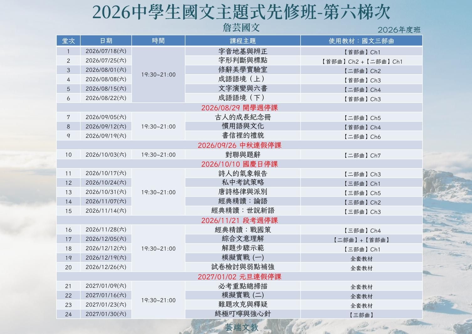 本課程並非單純的填鴨教學,而是配合出版社最新的「私中國文三部曲」教材,採用螺旋式上升的教學法: