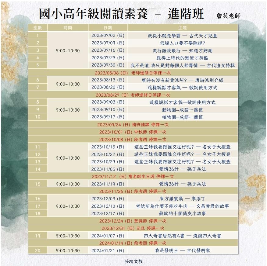 「閱讀素養課」是芸端文教的主打課程,而高年級閱讀素養課由詹芸老師親自授課,將大考常見的考題,完美地融入生活化的故事當中,並且加強孩子的文章理解、句意分析以及寫作能力。繼基礎班上過孫子兵法在商業上的應用、迪士尼公主的女權主義、詩人的好基友與古代渣男,進階班將更深入地從不同的觀點角度切入延伸的主題。