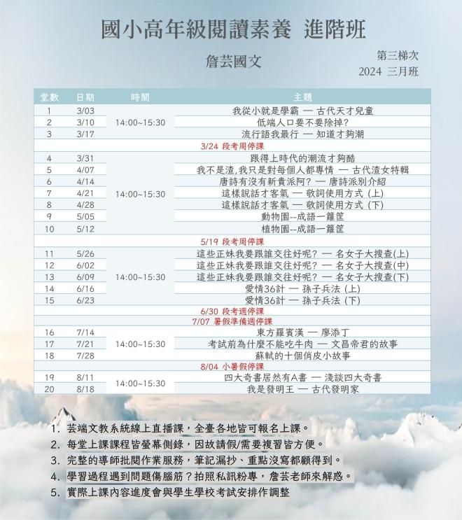 「閱讀素養課」是芸端文教的主打課程,而高年級閱讀素養課由詹芸老師親自授課,將大考常見的考題,完美地融入生活化的故事當中,並且加強孩子的文章理解、句意分析以及寫作能力。繼基礎班上過孫子兵法在商業上的應用、迪士尼公主的女權主義、詩人的好基友與古代渣男,進階班將更深入地從不同的觀點角度切入延伸的主題。