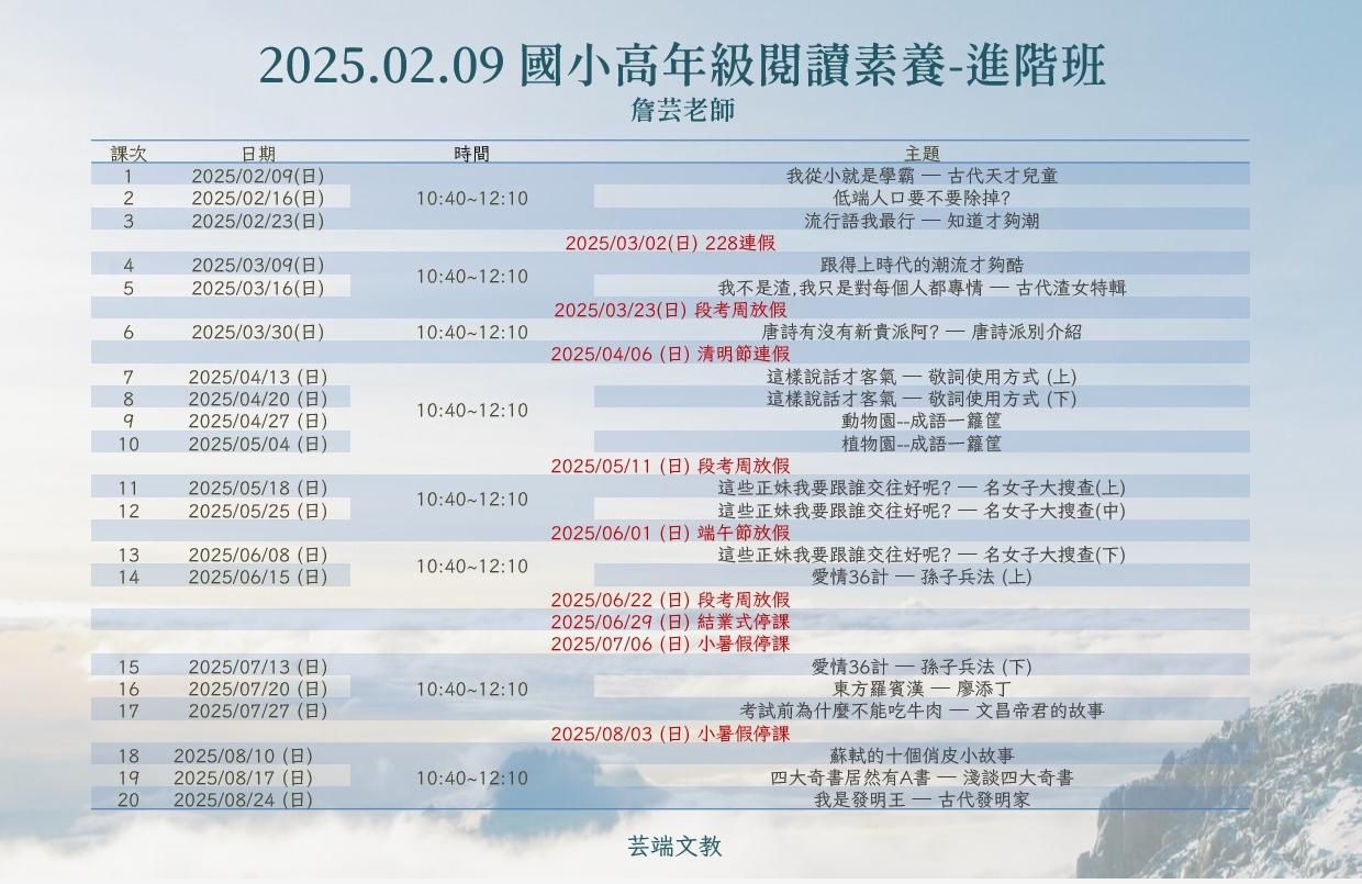 「閱讀素養課」是芸端文教的主打課程,而高年級閱讀素養課由詹芸老師親自授課,將大考常見的考題,完美地融入生活化的故事當中,並且加強孩子的文章理解、句意分析以及寫作能力。繼基礎班上過孫子兵法在商業上的應用、迪士尼公主的女權主義、詩人的好基友與古代渣男,進階班將更深入地從不同的觀點角度切入延伸的主題。