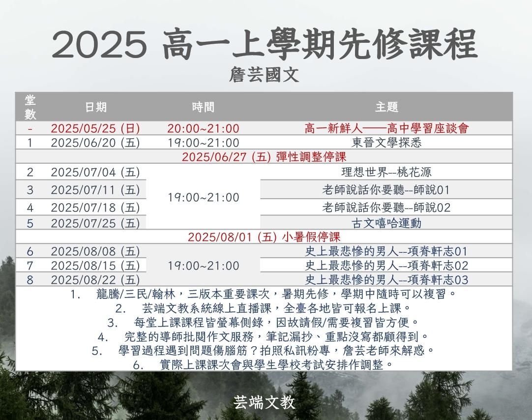 詹芸老師教授建中,中山女中,復興中學,薇閣中學等台北知名高中學生的家教班側錄影片課程,詳盡又紮實,有著頂尖學生近乎挑戰地詢問老師的刁鑽問題以及詹芸老師的專業拆解解惑!