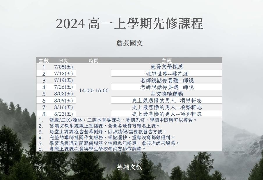 詹芸老師教授建中,中山女中,復興中學,薇閣中學等台北知名高中學生的家教班側錄影片課程,詳盡又紮實,有著頂尖學生近乎挑戰地詢問老師的刁鑽問題以及詹芸老師的專業拆解解惑!