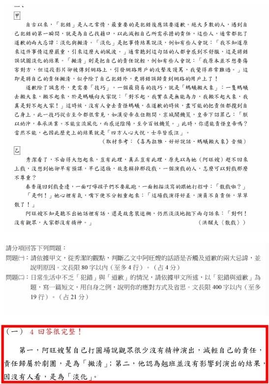 第一大題(知性論述文),只有 6.63% 學生拿到 A 級(18~25分)