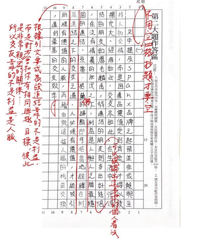 高中:承接國高中熟悉廣泛作文題材的基本寫作實力後,詹芸老師將作文篇章從題目審視、第一段、第二段、第三段、結尾,用一套結構化的"公式",解析面對撰寫作文的方法。