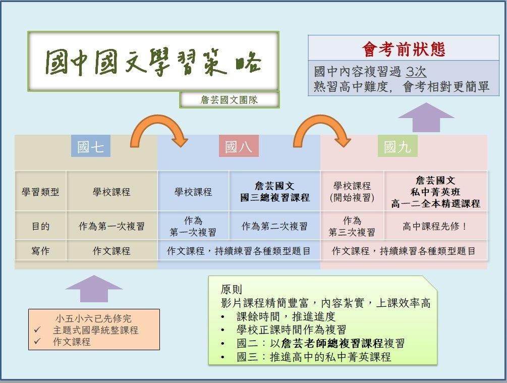 課餘時間 → 考慮上私中菁英班(含小論文指導)或高一二古文精選課程,先修高一進度